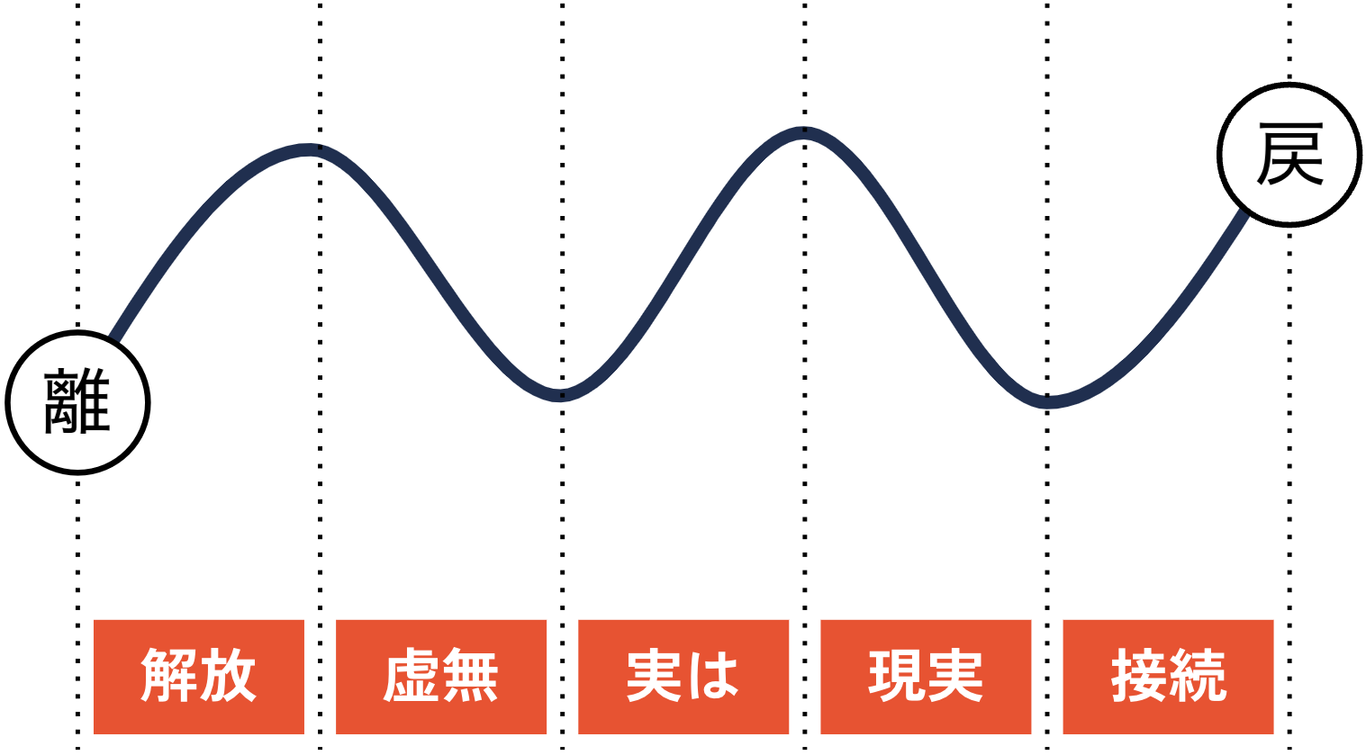 キャリアブレイクの始まりは、ポジティブである人もいれば、ネガティブである人もいます。ただ、どんな始まりだったとしても今まで歩んできた中心的な役割を手放す中で解放感を得たり、虚無感を持ったり、大きな気付きを得るといったプロセスには似た部分があります。キャリアブレイク研究所では、そのプロセスを5段階で示しています。